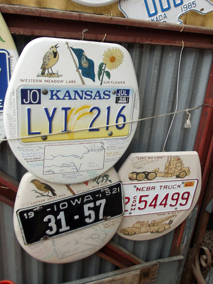 Toilet seats decorated with license plates and artwork. |